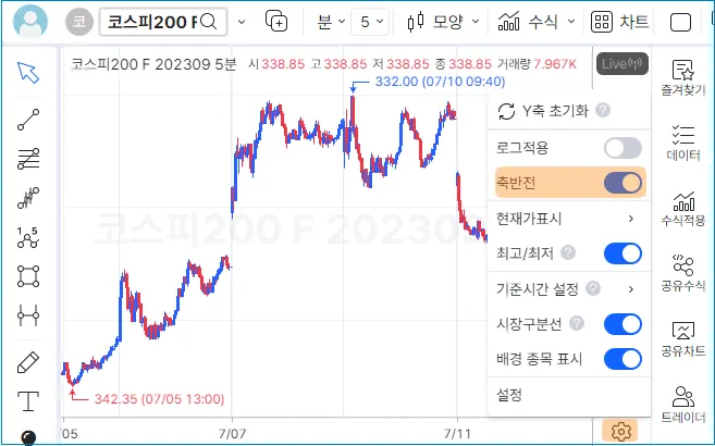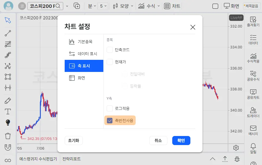 축반전은 설정메뉴나 [차트설정]에서 설정/해제가 가능합니다.