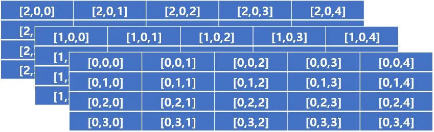 2차원 배열은 1차원을 여러개 가지고, 3차원은 2차원을 여러개 가지게 됩니다.