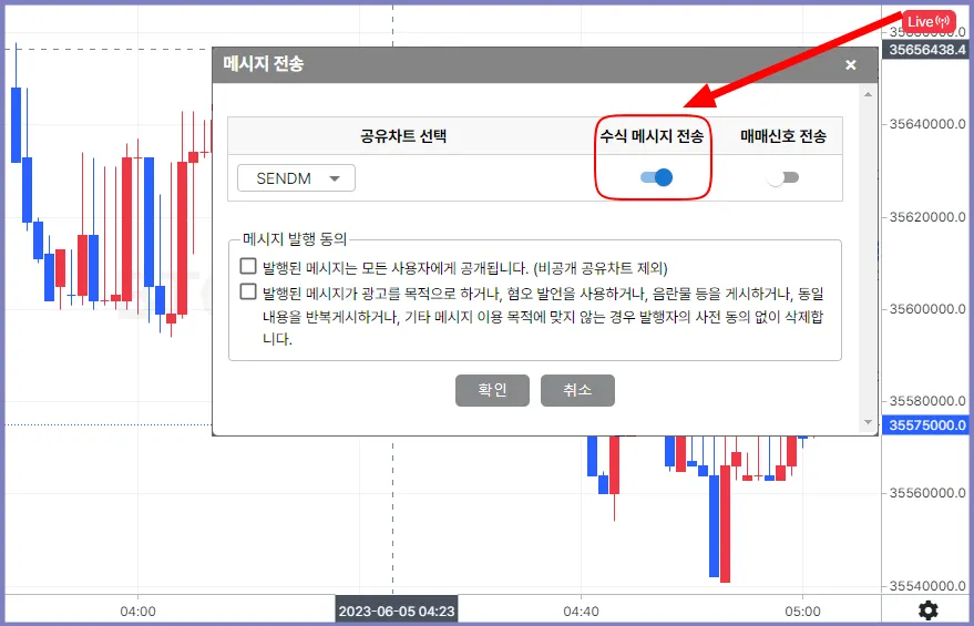 차트 LIVE모드에서 [수식메시지전송]기능이 켜져 있을 경우에만 출력할 수 있습니다.