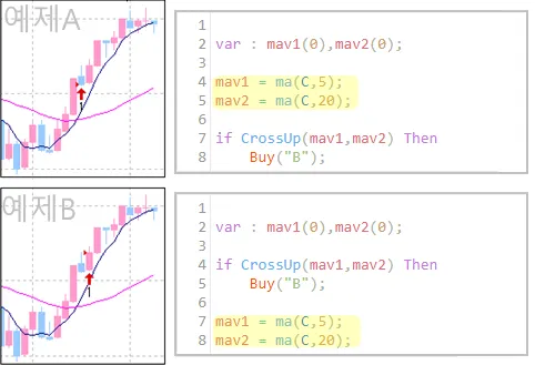 즉 예제B는 if문을 읽는 시점에서 이동평균값은 기존에(한봉전에) 저장된 값을