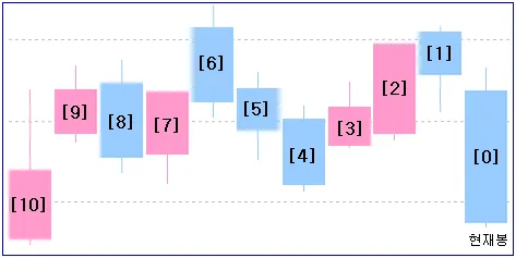 현재봉(기준봉)으로부터 몇 번째 과거 봉인지를 세어서 대괄호 안에 넣어주면 됩니다.