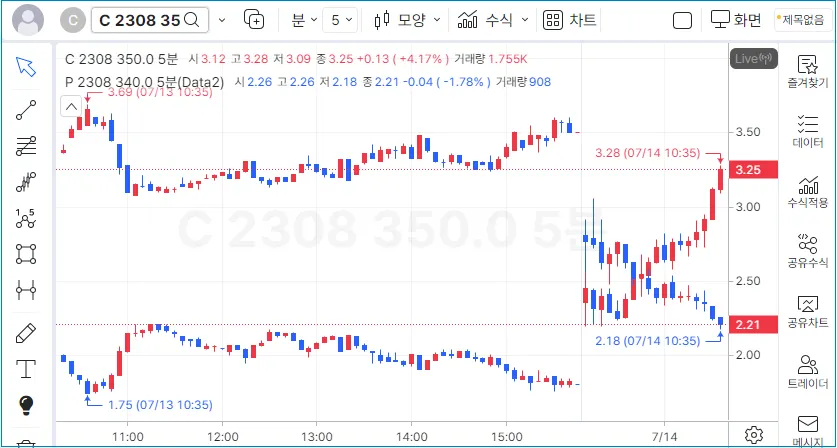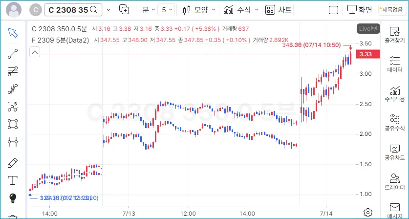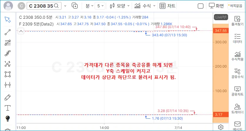 예를 들어 옵션 교차차트를 보기위해 기본종목이 콜종목인 차트에